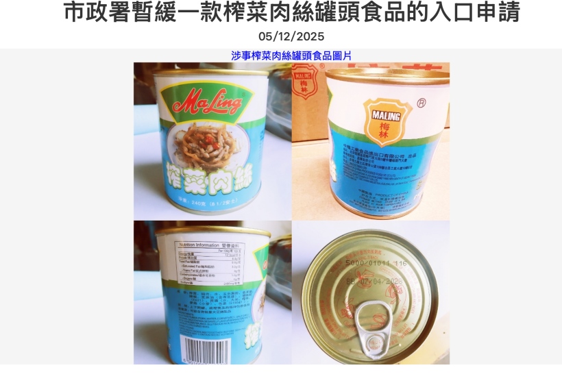 近日,澳门市政署通报一则食品检验检疫结果,一批进口至澳门的“梅林牌”榨菜肉丝罐头被检出磺胺二甲嘧啶残留量超标,超出当地标准1倍多。目前,港澳两地已启动紧急处置措施,涉事产品未流入澳门市面,香港则开展全面下架回收工作。