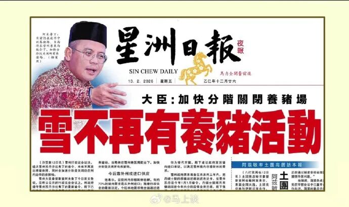 2026年2月,马来西亚雪兰莪州苏丹沙拉弗丁依德里斯沙发布谕令,明确表示“不同意在州内任何地区开展养猪业”,并建议通过进口猪肉方式满足市场需求。雪州政府随即跟进,宣布全面停止州内养猪活动,现有养猪场将分阶段关闭。
