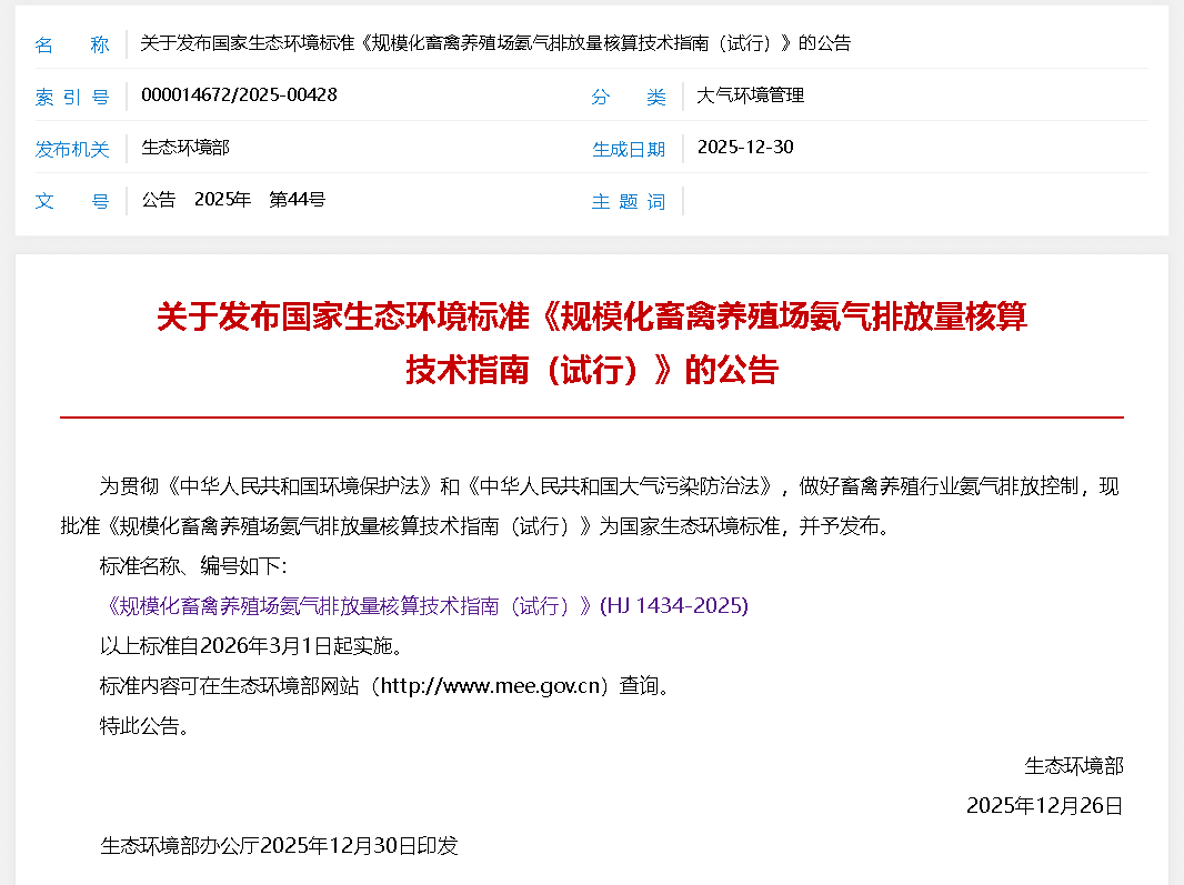2026年3月1日起,由生态环境部发布的国家生态环境标准《规模化畜禽养殖场氨气排放量核算技术指南(试行)》将在全国范围内正式实施。