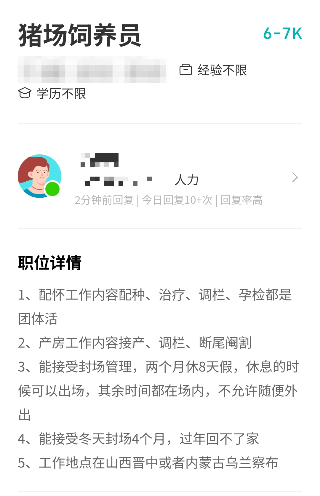 以某家公司的猪场饲养员岗位为例,其薪资范围为6000元至7000元,要求能接受封场管理,两个月休8天,休息时可以出场,其余时间都在场内(不允许随便外出),且要求能接受冬天封场4个月,过年无法回家。