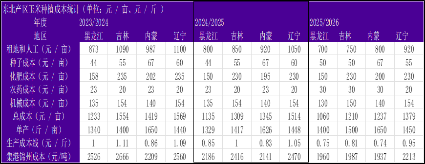 小结:2025/2026年度国内玉米种植面积略增,种植成本同比下降约8.3%,预期集港成本价为2000元/吨。