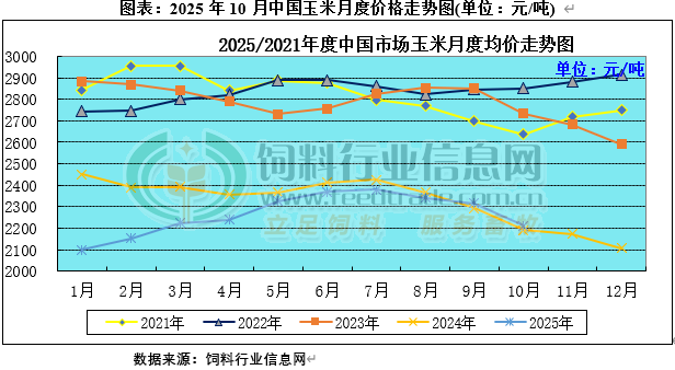 2025年10月国内主产区新玉米进入集中收获期,叠加天气因素新粮不易保管,基层种植户售粮积极性高,市场流通量显著提升,而收购主体及用粮企业建库需求一般,打压现货价格大幅下行,全国现货均价月环比下跌4.77%。