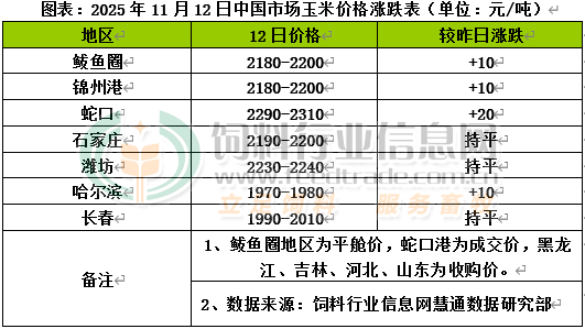 国内主产区种植户惜售情绪有所升温,市场供应逐渐减少,深加工厂门到货量维持低位,部分企业继续提价促收。东北产地降雪天气增多,基层上量相对不畅,北方港口晨间集港量小幅减少,贸易商收购价格小幅上调。南方港口库存有所减少,饲料企业多维持安全库存,按需采购为主。贸易商受成本支撑报价趋强。国内玉米现货价格基本稳定,局部小幅上涨。东北产区新季玉米收获进度接近尾声,烘干塔陆续开始收购新粮,由于气温同比偏高,部分潮粮存在销售压力,随着售粮进度的加快,基层种植户惜售情绪有所升温,贸易商采购增多,多地中储粮采购增加,饲料企业及深加工企业建库意愿增加,在到货不足的背景下加工企业开始提价收购。华北黄淮产区基层种植户售粮节奏放缓,市场供应小幅减少,深加工到货量维持低位,企业继续提价促收。深加工企业库存偏低,加工利润有所恢复,开机率维持相对高位,采购积极性也有所增加。饲料企业库存维持在20天以内,对本地粮择优采购,部分采购东北粮。
