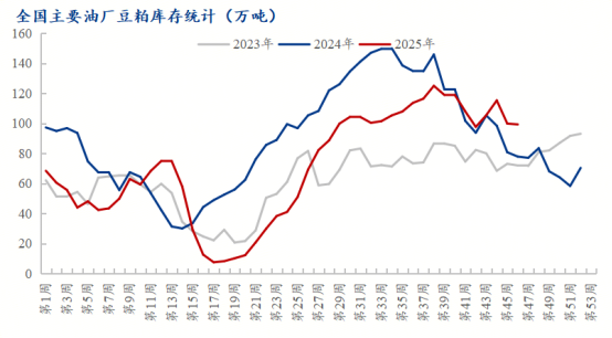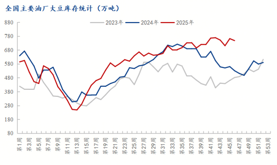 据Mysteel调查数据,2025年第46周,全国主要油厂大豆库存为747.71万吨,较上周减少14.24万吨,降幅1.87%,但同比仍增加217.11万吨,增幅40.92%,处于近三年同期最高水平。目前11–12月大豆到港压力依然显著,预计11月到港约970万吨,12月约700万吨,叠加前期结转库存,四季度供应压力有所缓解。此外,随着中美经贸关系缓和,中国已采购12月船期美豆26.4万吨,预计2026年2月到港;2026年1月采购的19.8万吨美豆预计3月到港,届时将缓解2026年2–3月国内大豆供应偏紧问题。豆粕库存为99.29万吨,较上周略降0.57万吨,降幅0.57%,同比仍增加21.43万吨,增幅27.52%,库存水平仍处百万量级,为近三年同期高位。当前全国油厂周度压榨量维持在200万吨以上,豆粕库存压力持续,下游普遍维持高库存、高头寸。