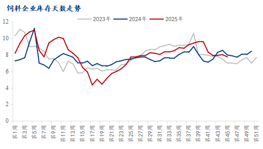 目前下游并未出现明显增库行为。截至2025年11月7日(第45周),国内饲料企业豆粕物理库存天数为7.75天,较10月底下降0.26天,降幅3.39%,较去年同期下降6.69%。豆粕现货方面,盘面走强但基差偏弱,下游采购情绪一般,多适量补库、刚需采购。由于豆粕整体库存偏高,且四季度供应预计保持宽松,饲料企业物理库存小幅下降,其中东北、广东及四川等地降幅较为明显。当前油厂开机率仍处相对高位,普遍存在催提情况,但去库节奏平缓。下游养殖端补库意愿偏低,需求表现平淡,月初企业多以消化库存、滚动补库为主,整体补库节奏较为谨慎。