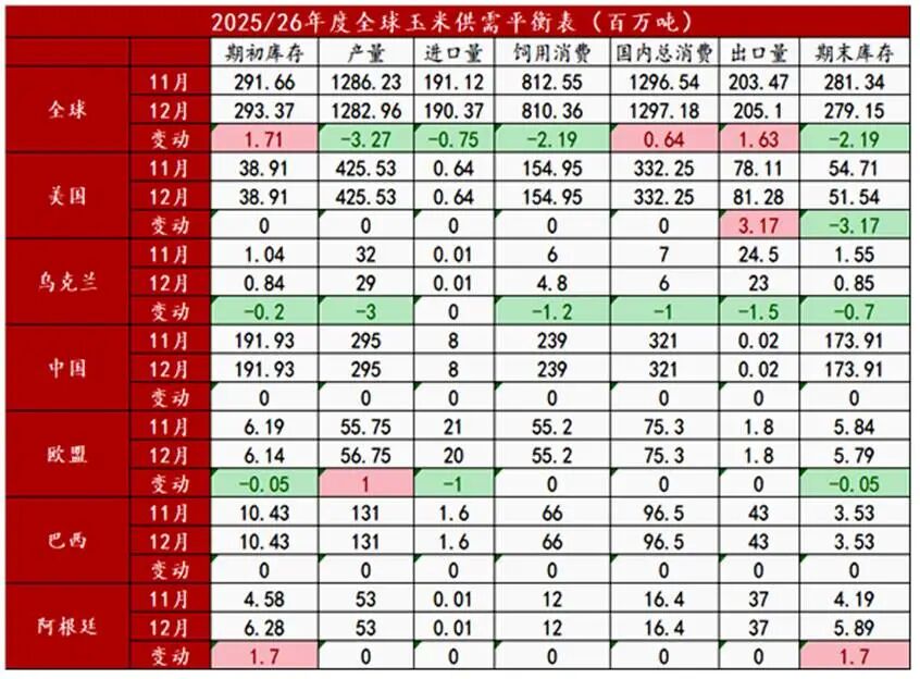 美国农业部(USDA)12月报告整体释放偏多信号,核心调整在于上修美国玉米出口预期,并同步下修新作全球及美国玉米期末库存,强化宽松程度收敛的预期。