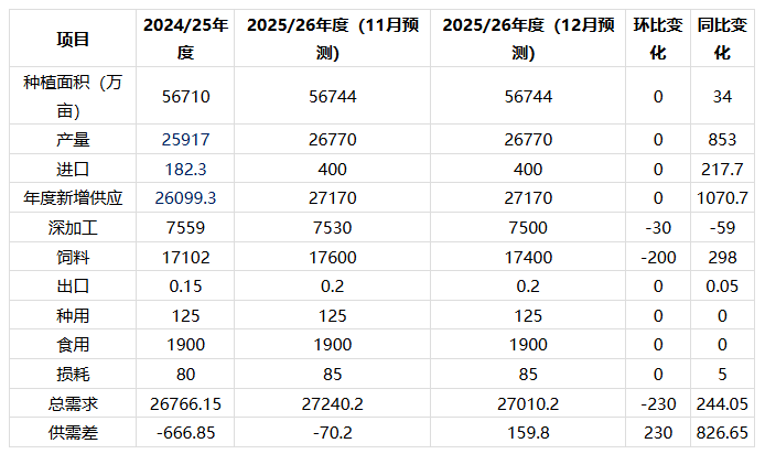 2025/26年度供需平衡表在12月的预期中,年度总供应量较11月预期持平。需求方面,饲料行业玉米消费量与深加工行业玉米消费量在12月的预期中较上月均有减少。根据本月预估的2025/26年度供需关系,相比2024/25年度趋于宽松,但依旧呈现相对紧平衡状态。