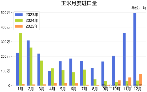 2025年1-12月玉米进口量共计264.77万吨,同比减少80.76%,其中进口来源地:巴西为160.72万吨(60.7%)、俄罗斯为44.4万吨(16.77%)、缅甸为28.87万吨(10.9%),其他合计30.78万吨(11.62%)。