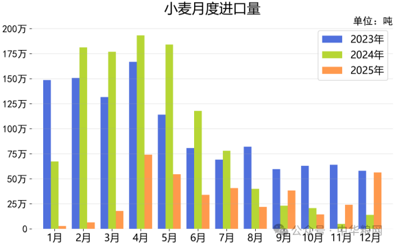 2025年1-12月小麦进口量共计385.08万吨,同比减少715.87万吨,减幅65.02%,其中进口来源地:加拿大271.26万吨(70.44%)、澳大利亚102.06万吨(26.5%),其他合计11.76万吨(3.06%)。