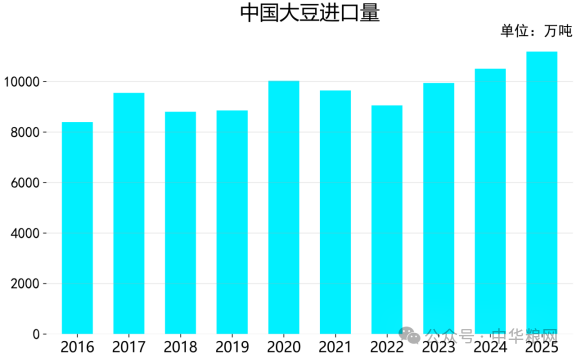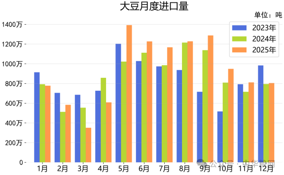 2025年1-12月大豆进口量共计11181.91万吨,同比增加6.46%,其中进口来源地:从巴西进口8232.82万吨(占比73.63%),同比增长10.3%;美国为1680.1万吨(15.03%),同比下降24%;从阿根廷进口789万吨,同比增长92.4%。
