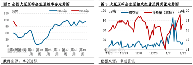 从豆粕现实供需基本面来看,上游供应整体宽松,需求端高位合同头寸滚动,现货购销氛围一般,市场变化较小,对豆粕价格难以形成有力单边驱动。据卓创资讯监测数据显示,截至1月16日,全国大豆压榨企业豆粕库存为91.20万吨,较上月末降低20.70万吨,创近6月来低点。大豆到港季节性下滑,部分工厂面临原料大豆衔接不畅导致的停机现象,上游压榨企业豆粕延续去库过程,但整体库存仍处于高位。豆粕现货货源供应充裕,少数企业仍存在催提情况,但催提力度较前期有所减弱。下游合同头寸保持滚动操作,随着春节备货窗口期的逐步收窄,物理库存有所增加,除受雨雪天气限制外,合同提货情绪有所改善。1月豆粕成交则在远月的积极带动下明显放量,上游企业榨利良好,积极推进销售,需求端考虑价格安全边际建立底仓。市场一度出现百万成交,集中于2-3月、5-7月及8-9月等基差组合。后续随着春节假期的临近,考虑物流及上游压榨企业的停机计划,下游仍存部分备货需求,但受限于实际需求体量及后市观点转为谨慎,备货规模或有限,对豆粕现货价格提振力度一般。