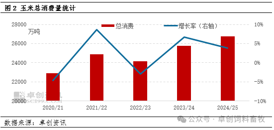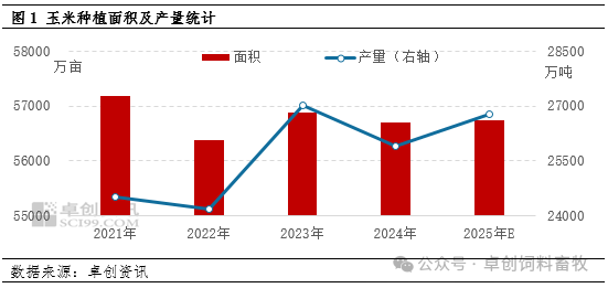 2026年中央一号文以“守牢粮食安全底线”为核心,通过稳定玉米供给、提高效能、保证收益来稳定玉米生产,保证国内玉米供应。据卓创资讯监测数据显示,2021-2025年中国玉米种植面积调整空间缩小,逐步稳定在56380万-57180万亩之间;2021-2025年中国玉米产量最高值为2023年的27027万吨,2024年受玉米主产区干旱及部分地区内涝影响,玉米产量小幅下降,2025年随多数地区水热条件改善,玉米产量增加至26770万吨。
