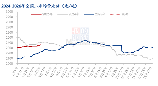 春节后全国玉米价格偏强运行,截至2月26日,全国玉米周度均价2340元/吨,较上周价格上涨7元/吨。分地区看呈现华北领涨、东北稳中有升。东北玉米价格偏强运行,现货报价较春节前上涨10-30元/吨。春节前及春节后期货市场均偏强运行,对现货市场有一定的支撑作用,此外春节后东北部分深加工收购价格也高于节前。华北地区玉米价格先涨后稳。基层粮点大部分从正月初八开始收购,但农户售粮尚未完全恢复。下游深加工企业从正月初四开始陆续启动玉米收购,经过春节期间消耗,企业都有补库需求,价格整体偏强运行。销区市场玉米价格稳中有涨。春节期间价格稳定,南方销区玉米市场购销活动基本停滞,下游饲料企业以消耗节前库存为主。节后价格偏强,产区价格上涨带动销区港口报价上涨。