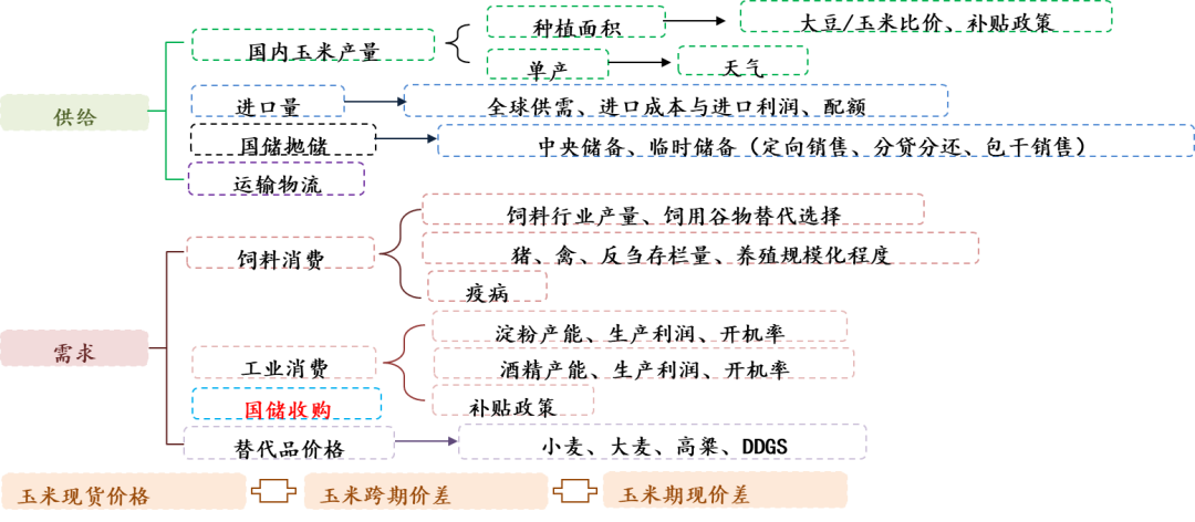 玉米一般采用供需平衡表分析法,供应端包括国内玉米产量、进口量、政策性抛储三个方面,其中玉米产量由种植面积和单产两个方面决定,进口量的主要影响因素包括全球供需情况、进口成本与利润及其配额等,政策性抛储主要包括央储和临储两大类,近年来还有进口储备及其调节性储备。需求端包括饲料消费、工业消费(深加工)与政策性储备收购等,其中饲料是指畜禽饲料中的能量原料需求,工业消费主要包括淀粉和酒精两大类,政策性储备收购目前主要是指调节性储备和中央储备收购两大类。