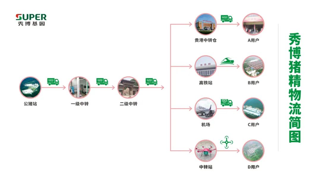 对于外购猪精的猪场来说,配送速度决定了效益,所以秀博打造自己的冷链物流系统,围绕的就是专业、科学、高效几个要点,多层级配送保障“说到就到”,近的冷链车直达,远的就高铁、飞机,全国各地都设有配送点,同时有一大批专业猪精配送员在为用精客户服务着!