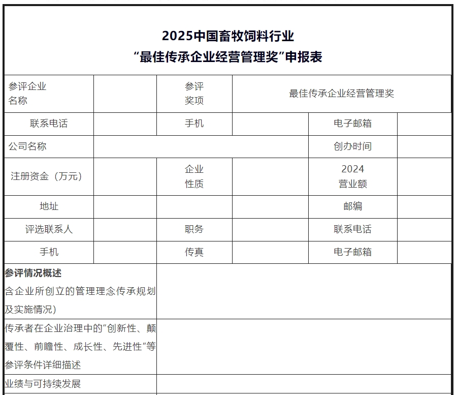 4、表彰阶段(12月6日)。最后结果将在“2025第22届畜牧饲料科技与经济高层论坛颁奖”仪式上公布“2025中国畜牧饲料行业——最佳传承企业经营管理奖”获奖企业名单并颁奖。