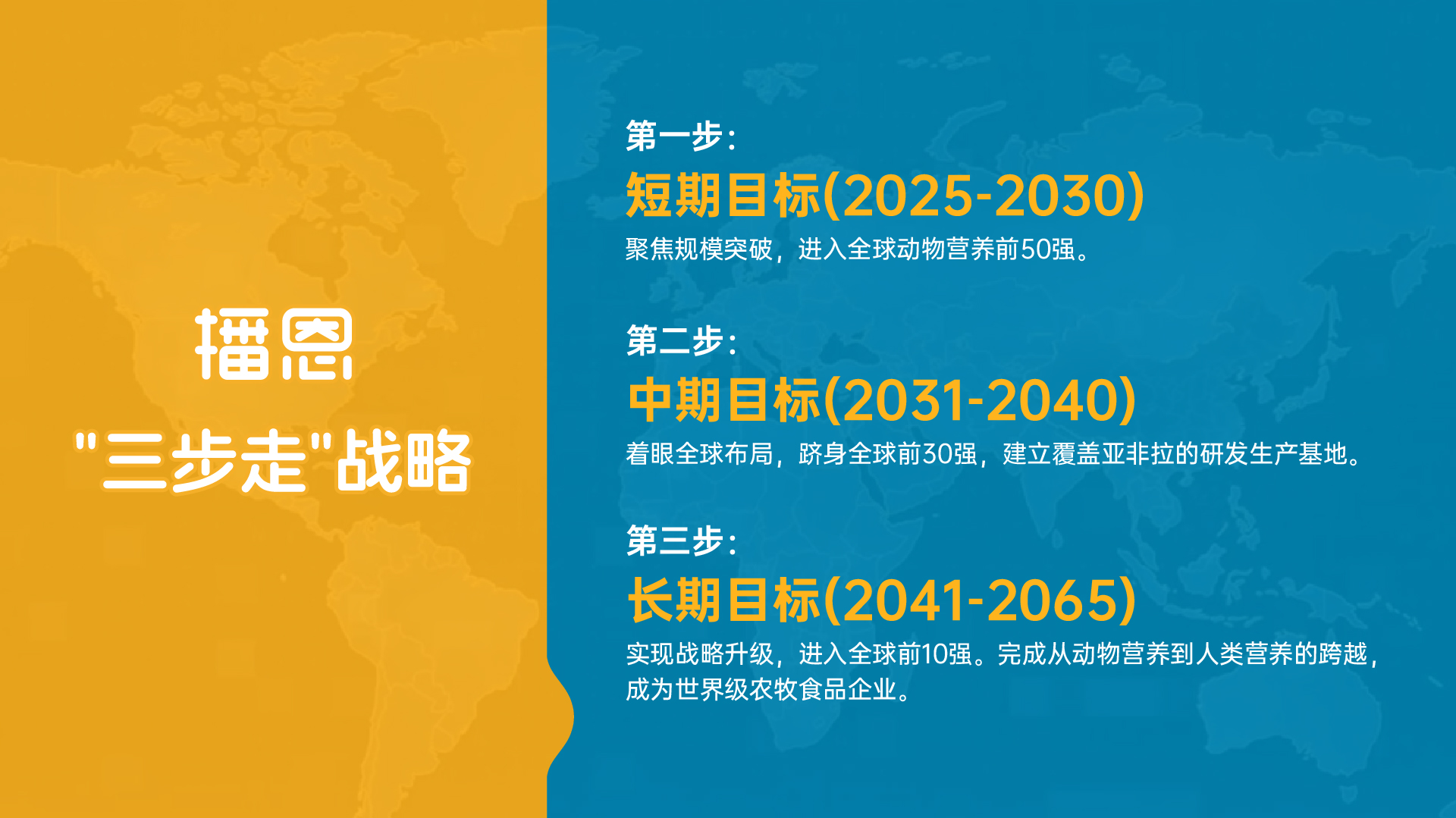 短期目标(2025-2030年)聚焦规模突破,进入全球动物营养前50强,成为中国动物营养领域的绝对领导者;