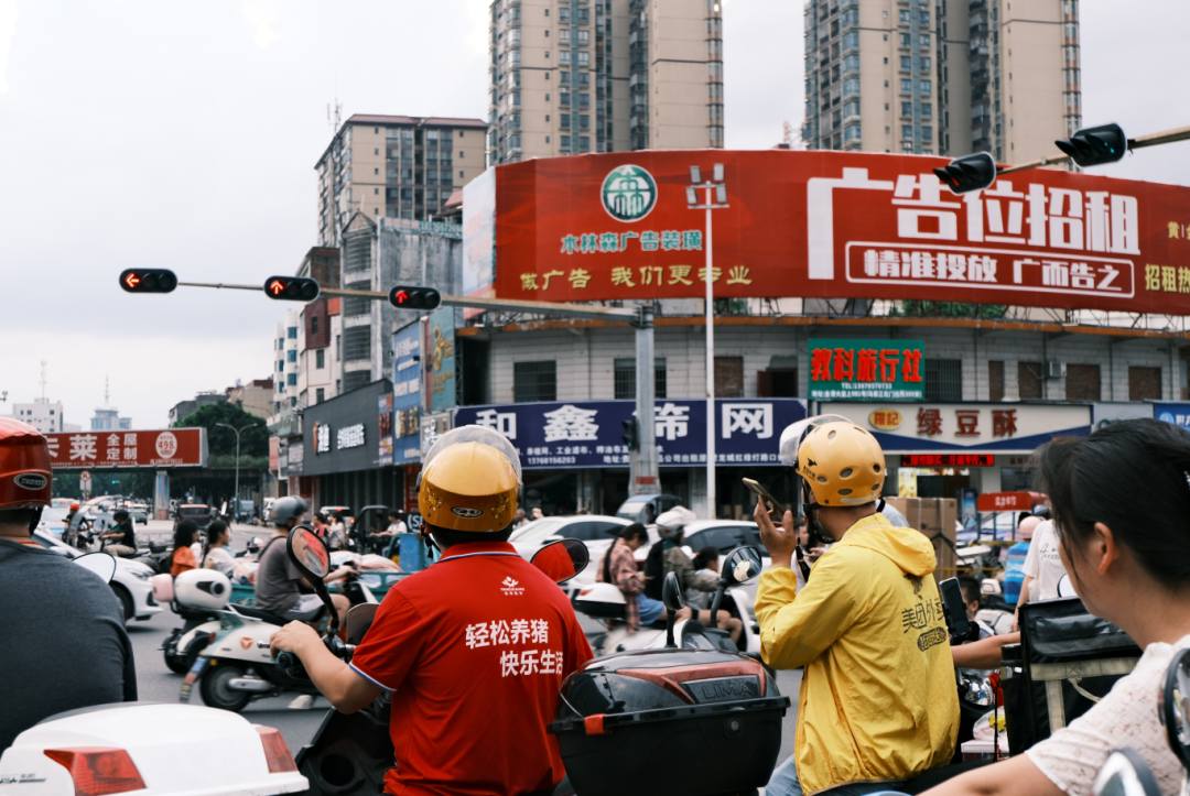 描述:2023年6月18日,下班回家路上,在客世界商场的十字路口遇到穿着文化衫的同事和美团外卖小哥并排,“大场”与“大厂”的并排,我拿着新买的相机立即按了一张。