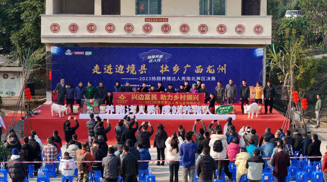 描述:扬翔养猪达人秀边境公益捐赠仪式:这不仅是养猪人的比赛,更是一次助力乡村振兴的活动。镜头里,背景的“扬翔养猪达人秀”横幅与乡亲们的笑脸同样鲜明。