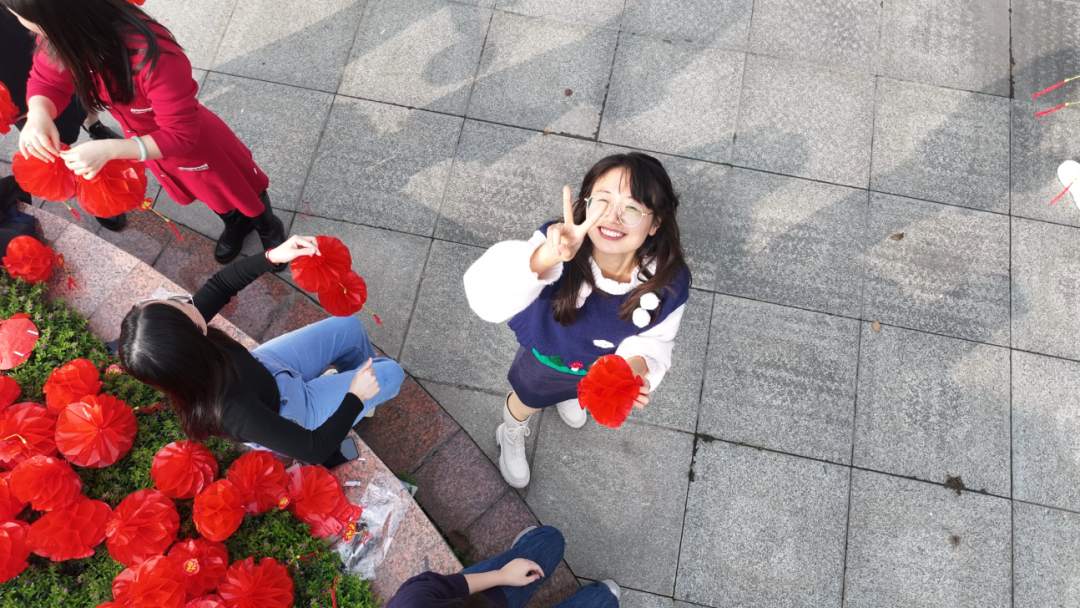 描述:新春挂灯笼,我们踮着脚把大红灯笼挂遍公司每个角落。快门按下时,主人公恰好对着镜头比出“耶”,脸上满是纯粹的笑。