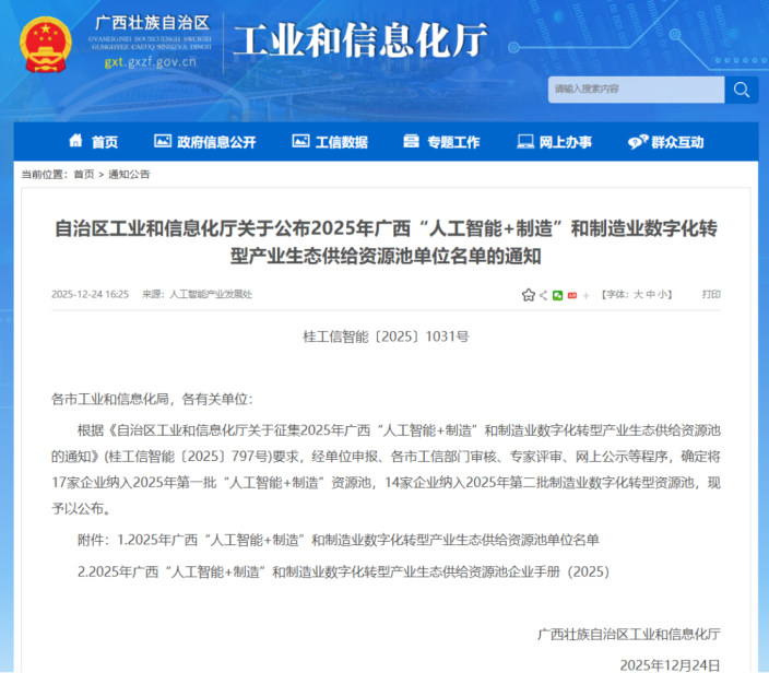 近日,自治区工业和信息化厅公布2025年广西“人工智能+制造”和制造业数字化转型产业生态供给资源池单位名单。扬翔集团旗下子公司广西数影科技有限公司成功入选!