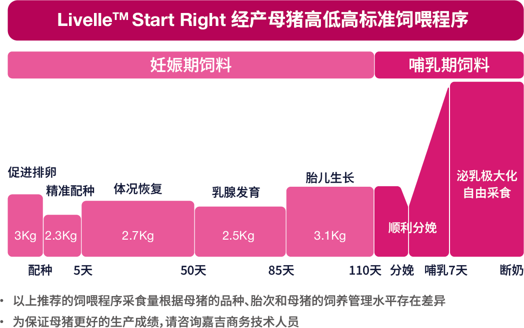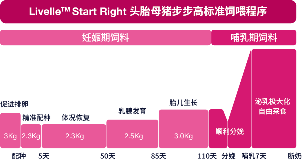 Livelle™Start Right嘉启优™借鉴人体“母体营养影响后代长期发展”的科学原理,将人体营养的科学理念应用于生猪养殖,通过科学营养调控,在母猪妊娠和泌乳阶段补充特定营养素,实现从根源上挖掘母猪遗传潜能,提升仔猪质量,激发猪群全周期生长潜力,助力农场的每一头仔猪实现“优质起点、更快生长、更重出栏”,从胚胎一路强大到育肥出栏!