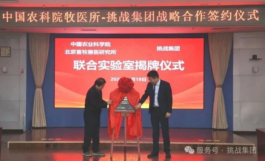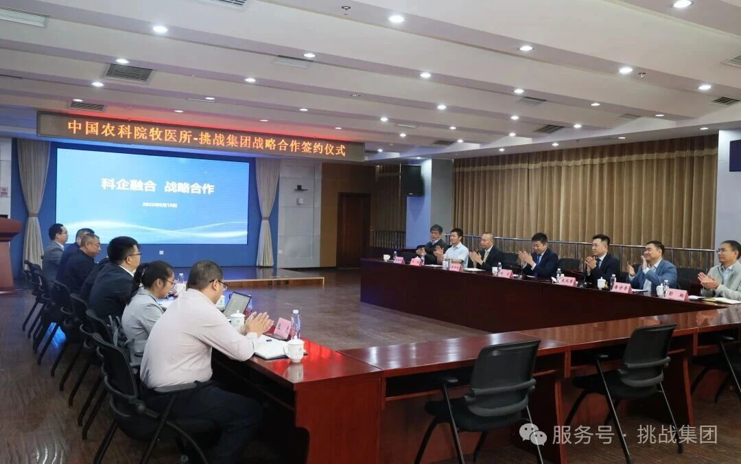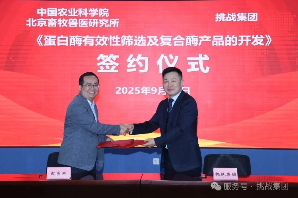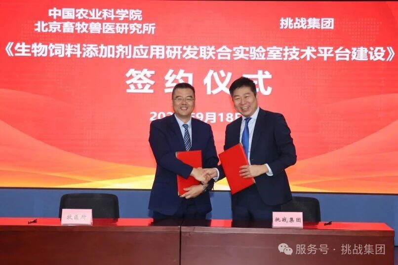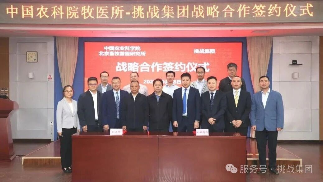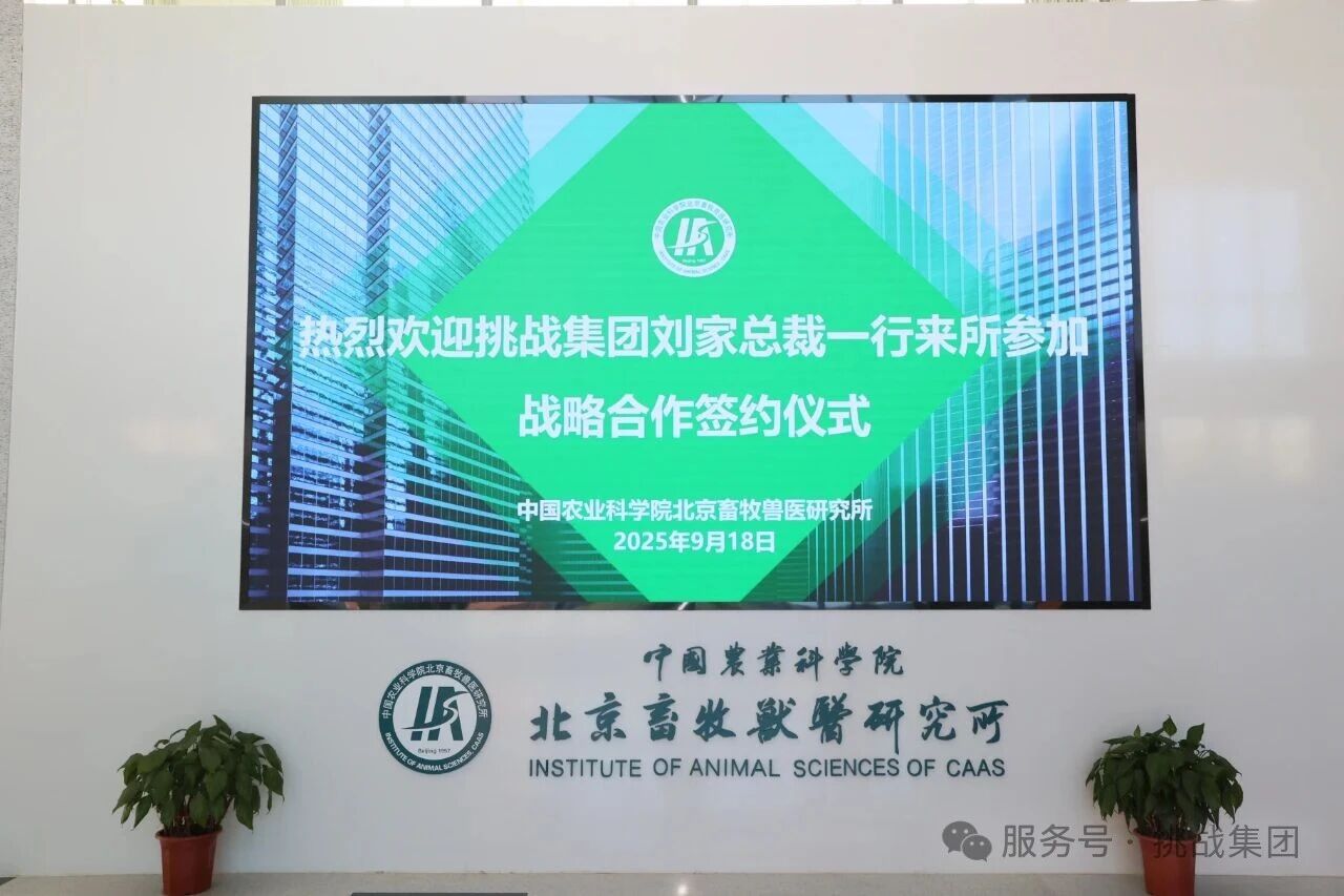 2025年9月18日,以“科研融合,战略合作”为主题的挑战集团与中国农业科学院北京畜牧兽医研究所战略合作协议签约仪式在中国农业科学院牧医1号楼3层报告厅成功举行。中国农业科学院北京畜牧兽医研究所所长张军民、副所长李俊雅、成果转化处处长袁维峰、鸡营养代谢与调控科技创新团队首席/研究员赵峰及团队核心成员,挑战集团轮值总裁刘家、副总裁王凤军、副总裁秦洪斌、董事会秘书/市场运营总监唐守营、挑战研究院副院长雷恒、助理院长彭翔、项目总监刘旭明等出席签约仪式。