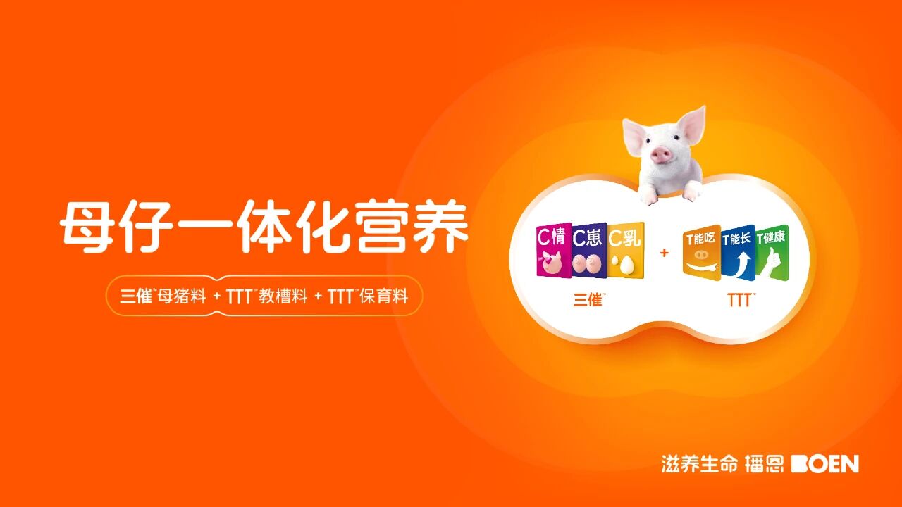 依托专业研发平台与成熟技术积淀,播恩“母仔一体化营养”方案构建了“枭雄公猪料+三催母猪料+TTT教保料”的全周期产品体系,形成“公猪营养奠基-母猪营养赋能-仔猪营养衔接”的效能闭环。方案通过精准适配不同养殖阶段的营养需求,助力提升养殖环节的管理效率与效益转化,让营养价值高效落地为养殖端实际收益,广受市场认可。
