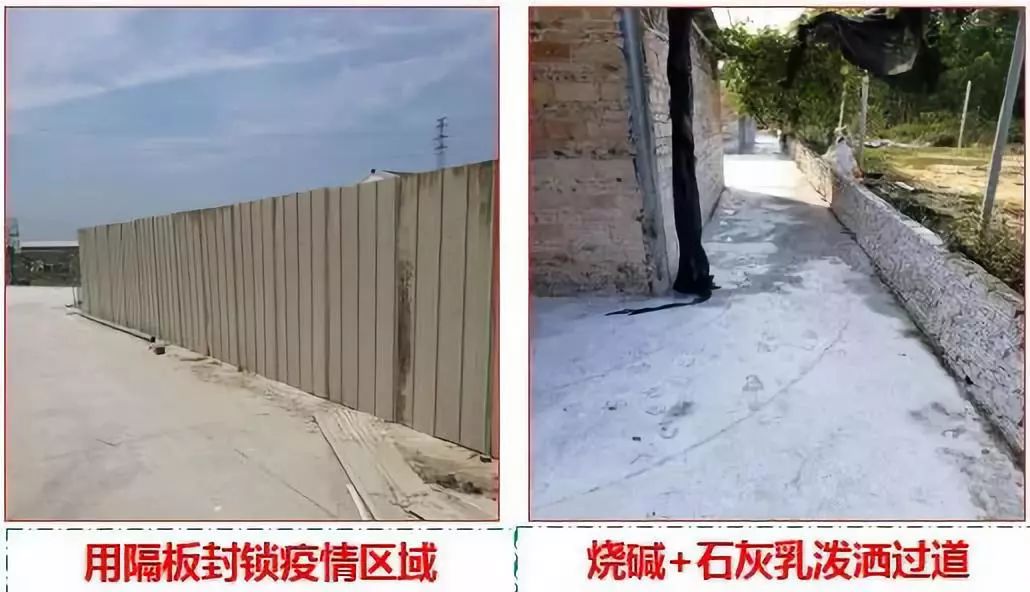 3)猪场所有道路、场地都做清理,泼洒20%石灰乳+2%烧碱消毒;