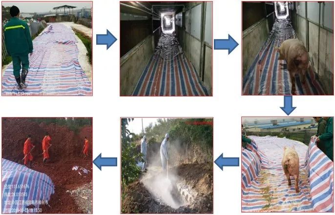 5)异常猪无害化处理——铺设彩条布,将猪通过彩条布赶到无害化处理坑深埋。