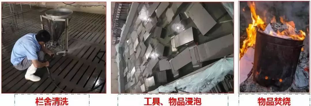 1)栏舍、工具清洗消毒:封闭栏舍,栏舍里面的人可以作为洗消人员执行清洗空栏流程;物品消毒后最好焚烧销毁,工具消毒后不能拿到其他栏舍使用;处理完毕后,所有人员要经过严格的洗澡、消毒和隔离;