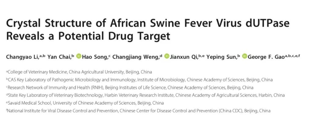 mBio是微生物研究领域的权威期刊,高福团队于10月29日在线发表了题为Crystal Structure of African Swine Fever Virus dUTPase Reveals a Potential Drug Target的文章,在非洲猪瘟病毒关键酶结构解析与药物靶点研究中取得突破性进展。药物靶点即药物与机体生物大分子的结合部位,找到药物靶点也就意味着找到了攻克疾病的“钥匙”。