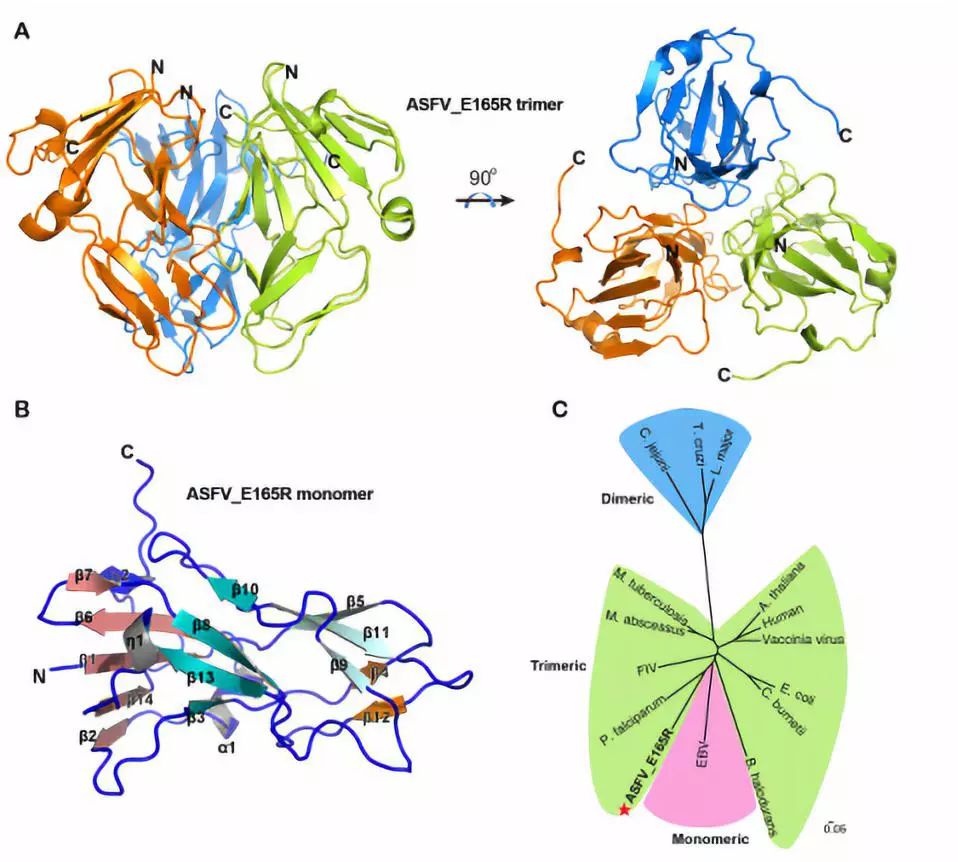 研究人员通过对ASFV焦磷酸酶E165R的晶体结构进行解析并于其它物种进行对比,发现其活性位点的晶体结构与结核分枝杆菌和恶性疟原虫的焦磷酸酶的活性位点高度相似,目前,对于这两种病原微生物已通过针对其焦磷酸酶活性位点开发出特异性治疗药物,而这些药物具有治疗ASFV感染的潜力。