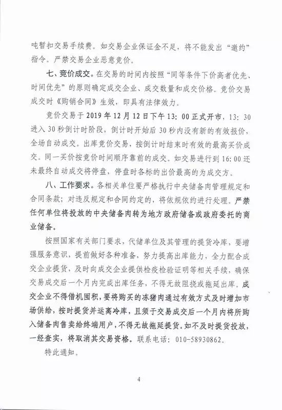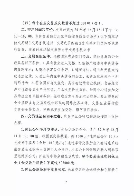 根据《商务部办公厅发展改革委办公斤财政部办公厅中国农业发展银行办公宴关于投放部分中央储备冻猪肉的通知》(商办运函[2019392号)要求,华商储备商品管理中心有限公司(以下简称华商中心)组织实施中夹储备冻猪肉投放工作,通过竟价交易方式进行。现就投放交易有关事项通知如下: