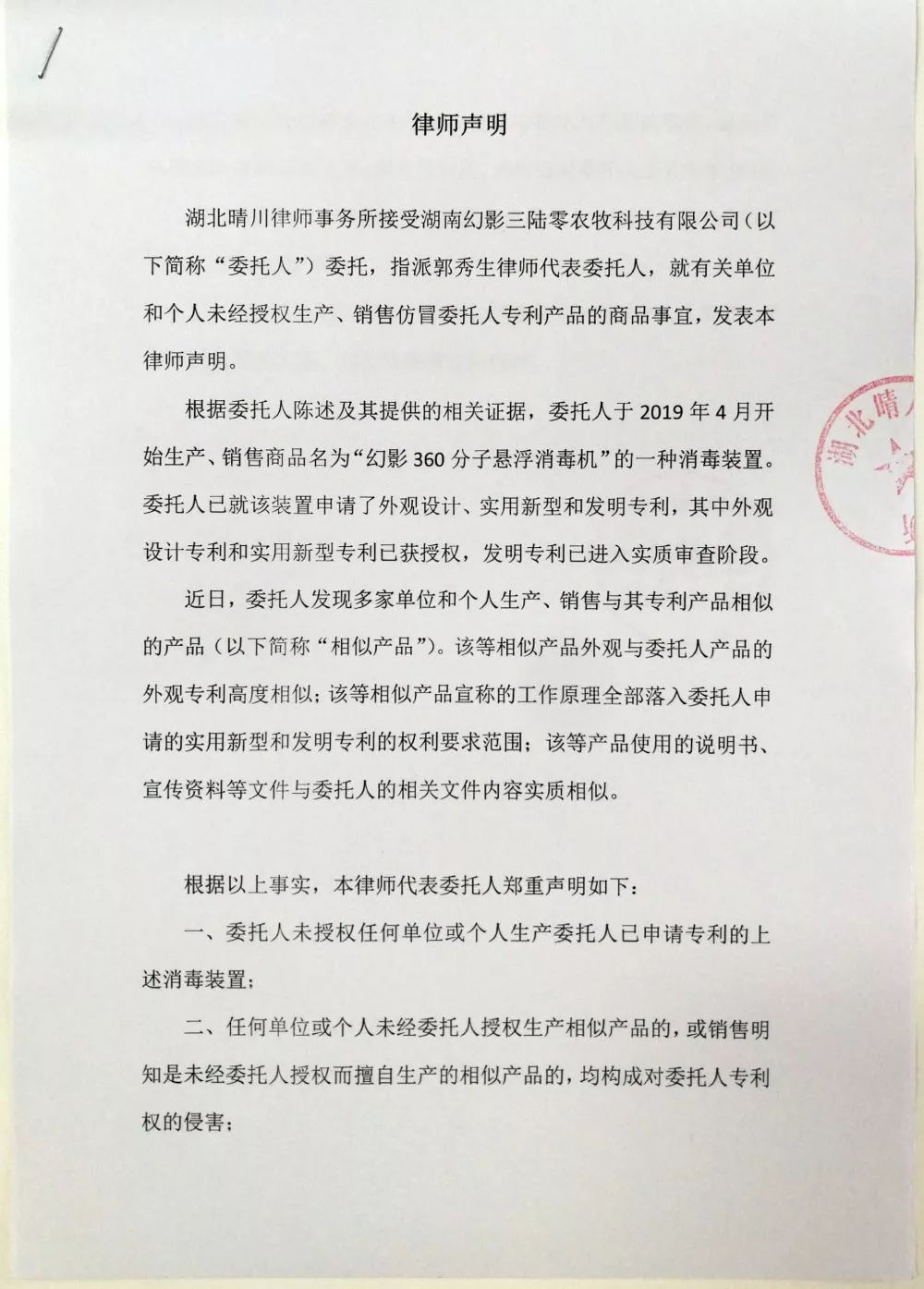 再此幻影公司郑重申明,幻影公司没有委托过任何单位和个人生产相关产品,以下为幻影公司委托湖北晴川律师事务所就有关单位和个人未经授权生产、销售仿冒委托人专利产品的商品事宜,发表律师声明。