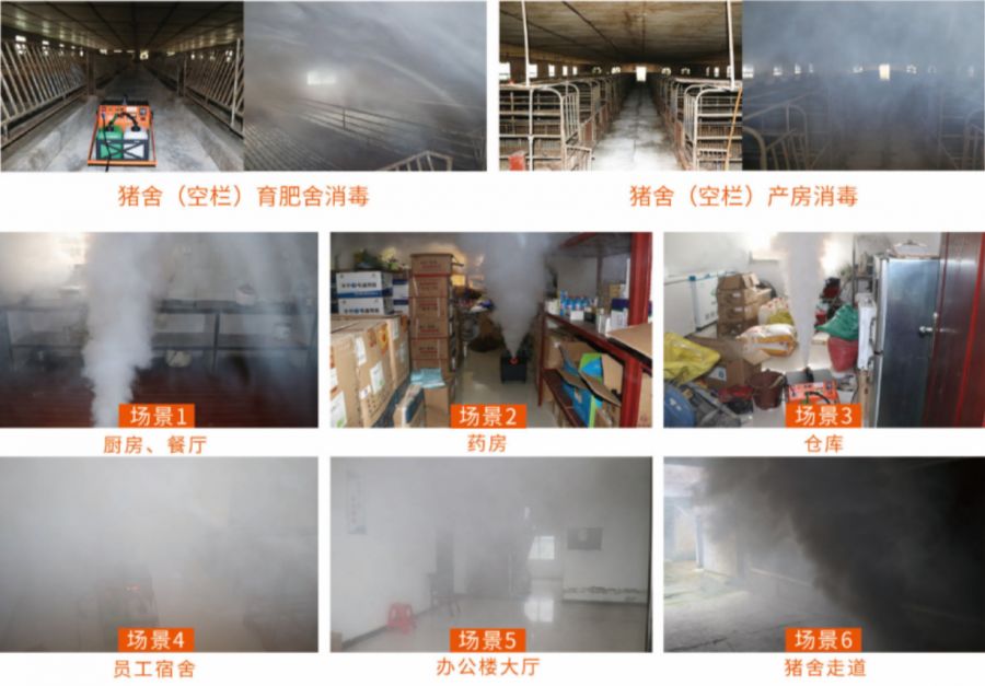 可以实现猪场众多空间如办公室,仓库,宿舍,食堂,圈舍等场所的无死角消毒,高效无忧;对于消毒人员而言,执行力百分百到位,操作十分简单,放上药水,开机即用,带畜禽消毒同样如此,换对应的消毒药即可,省时省力省事,空间消毒so easy。