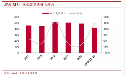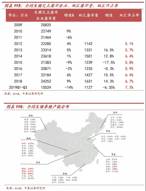 千亿屠宰行业低集中度,双汇市占率稳步提升。1)屠宰行业规模:全国定点生猪屠宰企业屠宰量2018年为2.4亿头,增速9%、2019.1-9月是1.5亿头,增速-14%。其中双汇2018年屠宰生猪1631万头,增速14.3%、2019.1-9月为1127万头,增速-6.35%。2)市占率:双汇屠宰集中度提升大势所趋。双汇2012年屠宰在全国生猪定点屠宰统计占比5.1%,2019Q3提升至7.3%。全国布局,通过跨省资源配置、规范屠宰检疫等,快速提升市占率。长期看双汇规范化、集约化龙头优势凸显,预计屠宰市占率持续提升。