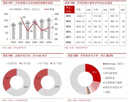肉制品特点:传统高温肉保持稳健,低温肉制品成为主要趋势。我国是世界上生产肉类和消费肉类第一大国。我国对于肉类的制品一般分为两大类:其中一类是中国传统风味中式肉制品,如:德州扒鸡、金华火腿、南京板鸭、广式腊肠等全国各地多种有名的产品;另一类则是具有中国特色风味的西式肉制品,如:培根类、香肠火腿类、肉冻类以及肉糕类等。1)根据据沙利文数据统计, 2017年全国肉制品产量突破1600万吨。其中,低温肉制品产量达1072万吨,占肉制品总产量的64.3%;中高温肉制品产量达595万吨;占肉制品总产量的35.7%。2)根据欧睿数据统计,2018肉制品+冷鲜肉总计销量预计6708万吨,增速1%,销售额1.7万亿,增速5%。可以看出吨价的提升幅度更快,主因一是消费升级,肉制品高端化趋势;二是猪周期性波动,2018年开始中国生猪养殖规模的缩小+非洲猪瘟影响,生猪存栏数量大幅减少,肉制品行业加工成本的提高驱动行业性提价。