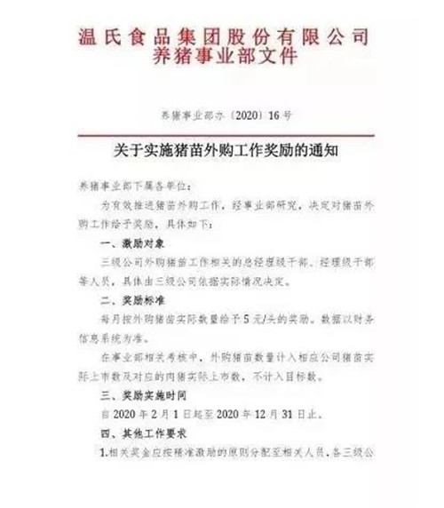 首先,温氏内部发文鼓励员工帮助外购仔猪的消息已经得到了“猪场动力网”的证实。温氏的生猪出栏量位居全国第一(甚至世界第一),遥遥领先第二名。这样的一家企业无疑已成为行业的风向标。在我的记忆中,还没有发现温氏有大量外购仔猪的历史,更别说是发文奖励。用“史无前例”这个词来形容这件事恐怕并不为过。