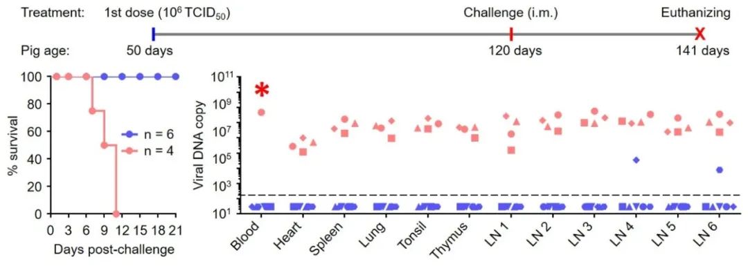 图2:七基因缺失疫苗HLJ/18-7GD免疫对非洲猪瘟病毒强毒株致死性攻击提供完全保护