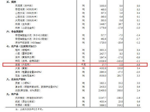据对24个省(区、市)流通领域9大类50种重要生产资料市场价格的监测显示,2020年2月下旬与2月中旬相比,22种产品价格上涨,27种下降,1种持平。其中,2月下旬生猪(外三元)价格为37.7元/千克,与2月中旬相比跌4.6%。