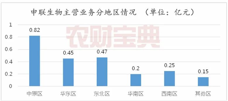 从申联生物主营业务分地区来看,中原区江西、河北、河南、湖北和山西营收最高为0.82亿元,其次是东北区吉林、辽宁、黑龙江、内蒙古、北京和天津,营收0.47亿元。而营收最低的是华南地区湖南、广东、广西和海南。