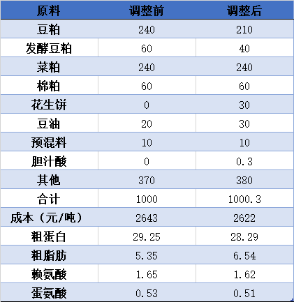 背景:江西水产饲料容量60万吨,去年由于饲料原料价格上涨,而终端产品售价没有变化,饲料企业只能压缩配方结构空间,导致今年饲料系数比往年普遍偏高0.2-0.3,达到2-2.1。而与我们合作的当地xxx水产饲料企业,年产草鱼料5-6万吨,经过沟通后针对草鱼料配方结构调整(低蛋白/高脂肪),配方变化如下: