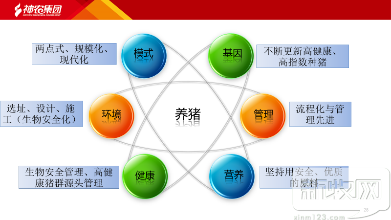 近年来养殖业迅猛发展,越来越多的人意识到并非简简单单就能把猪养好。陈俭告诉记者,神农集团很早之前就意识到养猪是一项系统性工程,模式、环境、健康、营养、管理和基因六大要素缺一不可。陈俭表示,任何一方面的工作不到位,就不能说把养猪的工作做好。