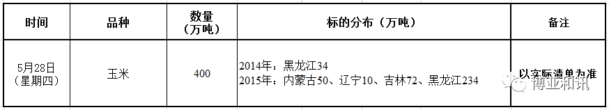 5月20日,国家粮食交易中心发布公告,5月28日开展国家临储玉米竞价交易,投放量400万吨。同时,公布2014年粮源和2015年粮源拍卖底价与2019年持平。