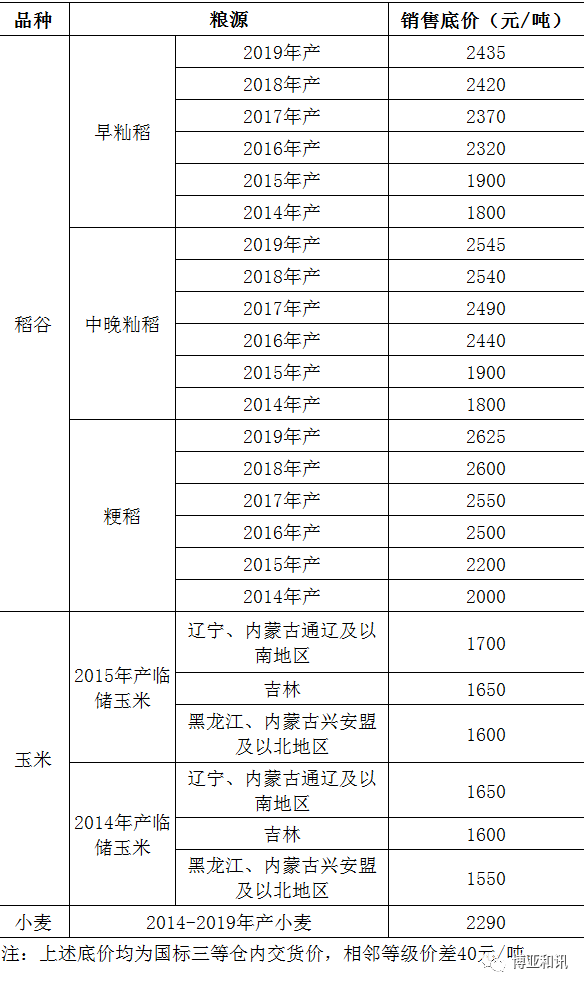 接国家有关部门通知,自2020年6月1日起调整部分品种国家政策性粮食销售底价,具体价格如下: