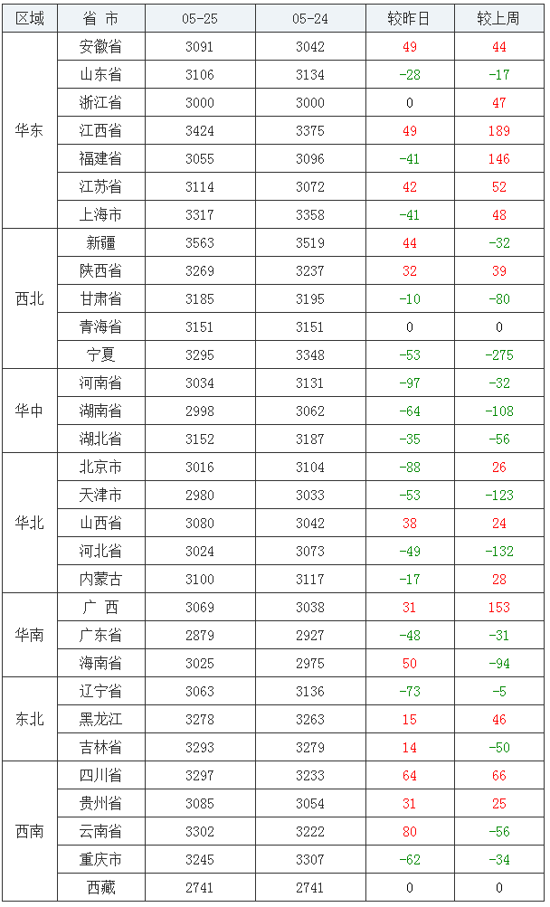 玉米均价(饲料原料)前五:云南省2329元/吨、贵州省2279元/吨、湖南省2246元/吨、四川省2228元/吨、重庆市2206元/吨;