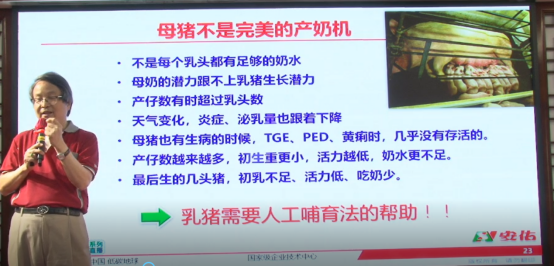 洪平先生提到,最有效提升仔猪生长潜力的就是提升采食量,但在产房阶段,母猪不是完美的产奶机,如何保证产房仔猪采食足够,除了母猪管理外,洪先生还提到几个比较实用的人工哺育方法: