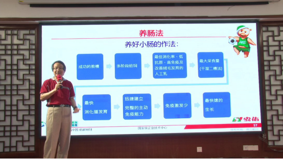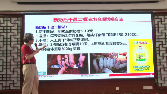 洪平先生,特别提到断奶离开母猪不离开奶,但一直喂奶有不利于干料的切换,所以安佑提出了干湿二槽法,这个方法已经持续使用了十几年,之前都是用教槽料泡湿料,为了更加方便,安佑在2019年推出了液体奶特伦喝,它里面除了奶制品外,还含有生淀粉、酸化剂、单糖等刺激消化道发育,避免换料二次应激。