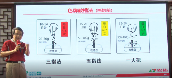 安佑早年提出的色牌教槽法,以达到充分诱食及早期促进消化道发育的效果。